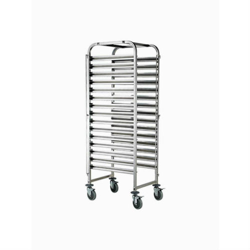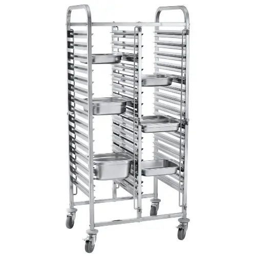 Deze regaalwagen 30 x GN 1/1 biedt ruimte voor 30 stuks GN 1/1 dienbladen is een praktische en efficiënte oplossing voor het vervoeren en opslaan van gastronorm bakken tijdens evenementen, beurzen of grootschalige cateringopdrachten.